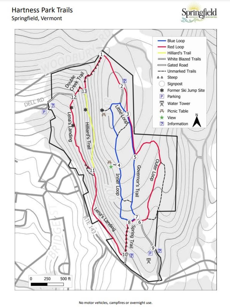 To access the northern trailhead near downtown, park at the Robert B. Jones Industrial Center, 280 Clinton Street, with space for 20-50 cars. From Interstate 91, take Exit 7 and follow VT Route 11 west for approximately 2.5 miles; the trailhead is on the right. From downtown Springfield, follow Route 11 (Main St. and Clinton St.) east for 1.2 miles from the downtown traffic light; the trailhead is on the left.